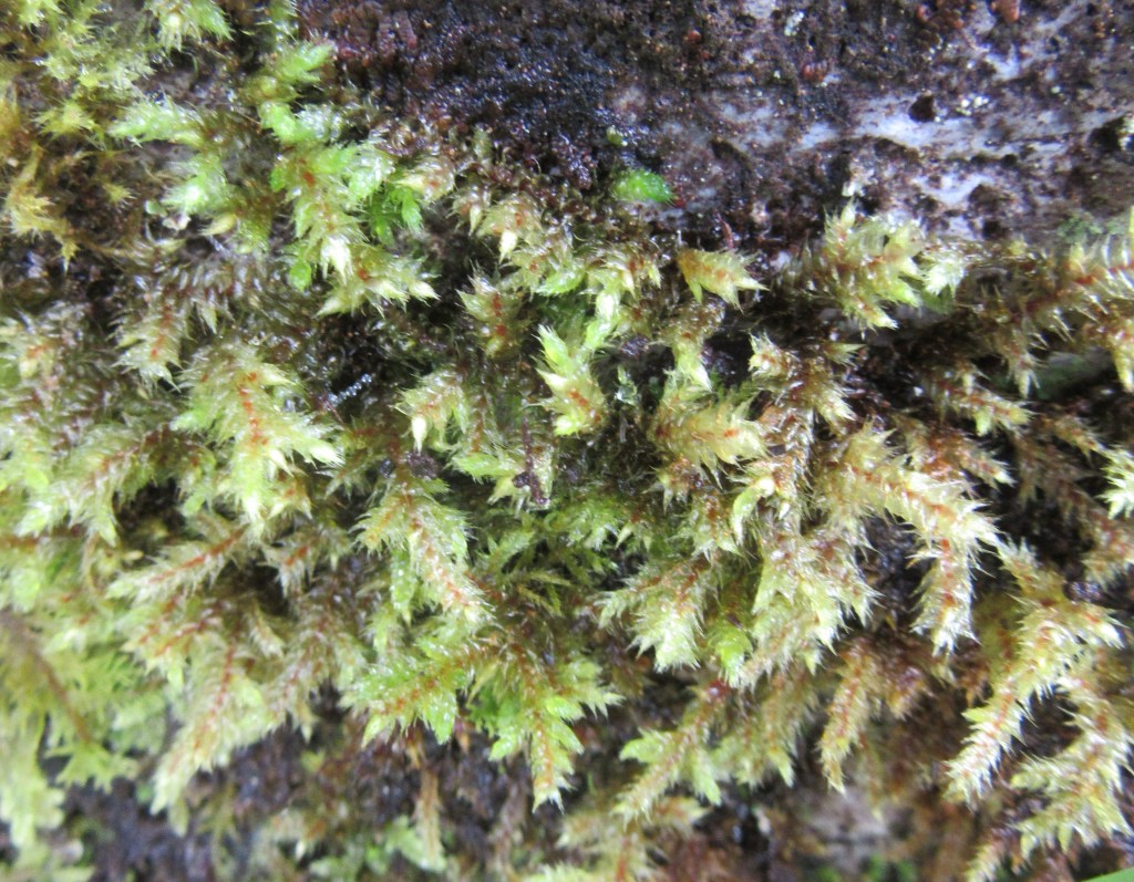 A pleurocarpous moss with reddish stems and leaves that are often tinged golden. The species forms loose mats of branched shoots at the tip of which leaves may turn over to one side. Characteristic are the recurved teeth along the margins of the leaves.