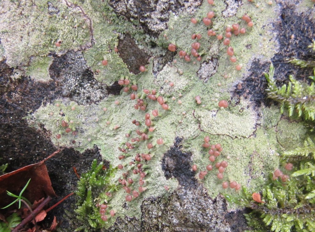 A crustose species that often forms greenish grey granules crustose species that may become sorediate. It is instantly recognisable on basis of its pink (when wet) or brown stalked, apothecia that often look like mini-toadstools.