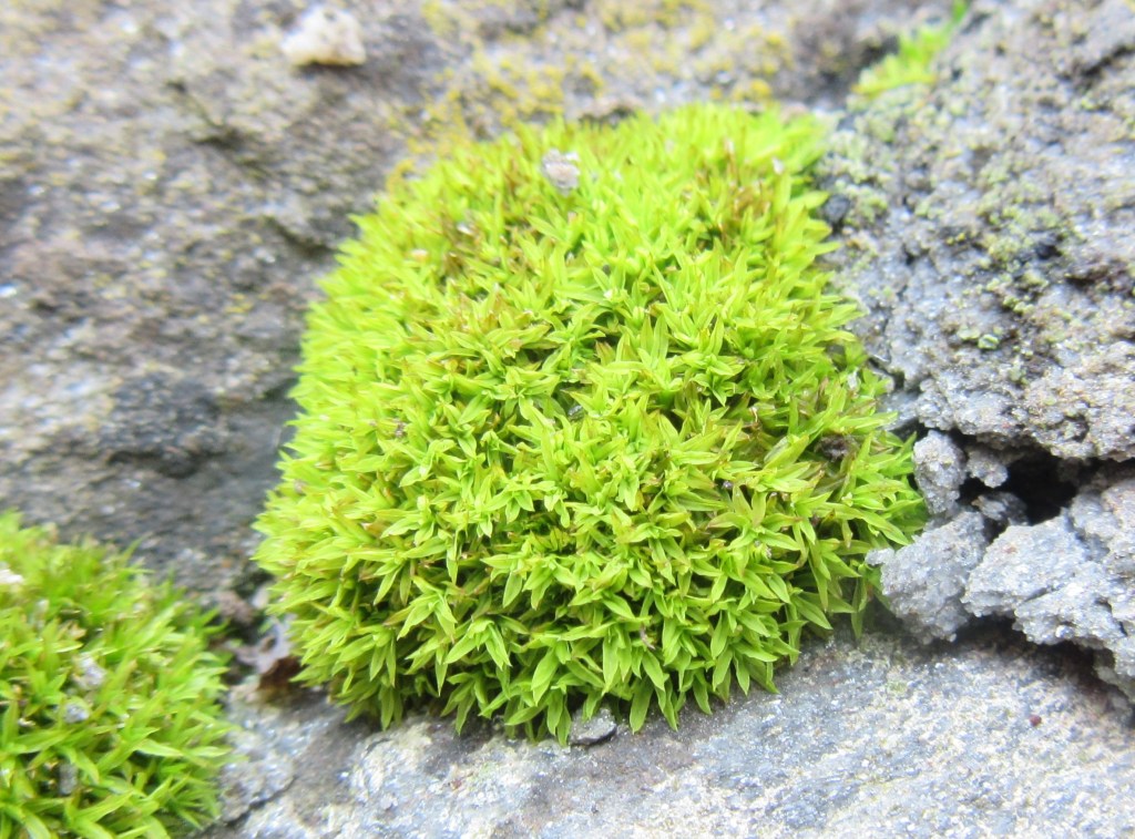 An acrocarpous species that forms bright yellow-green cushions or tufts. The shoots have spreading, parallel-sided leaves with a tapering tip. The nerve may be shortly excurrent and the leaf margins may be recurved below. The leaves become twisted when dry.