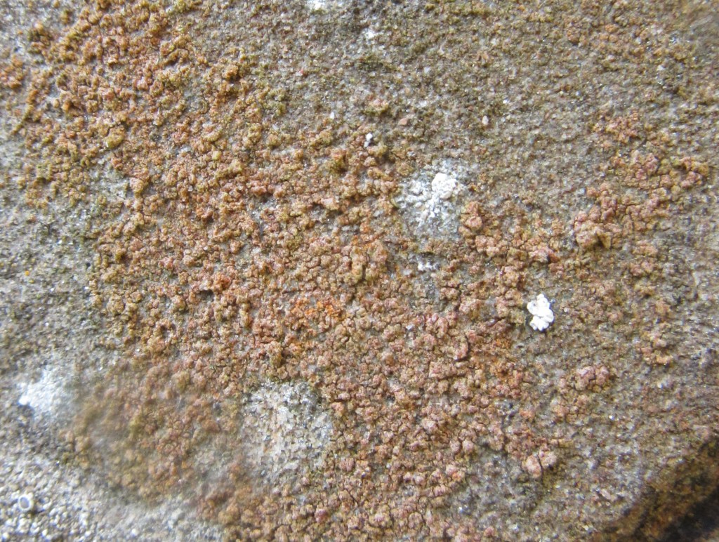 A crustose species with a pink-orange to red crust that can be flecked white. The crust is uneven, irregularly cracked and finely powdery-granular.