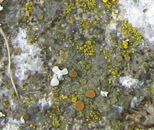 A crustose, widespreading species with a dark bluish grey thallus that is cracked to areolate and often densely covered in small, granular isidia that give the surface a rough appearance. Apothecia have yellow to orange discs and a thick irregular and often granular margin.