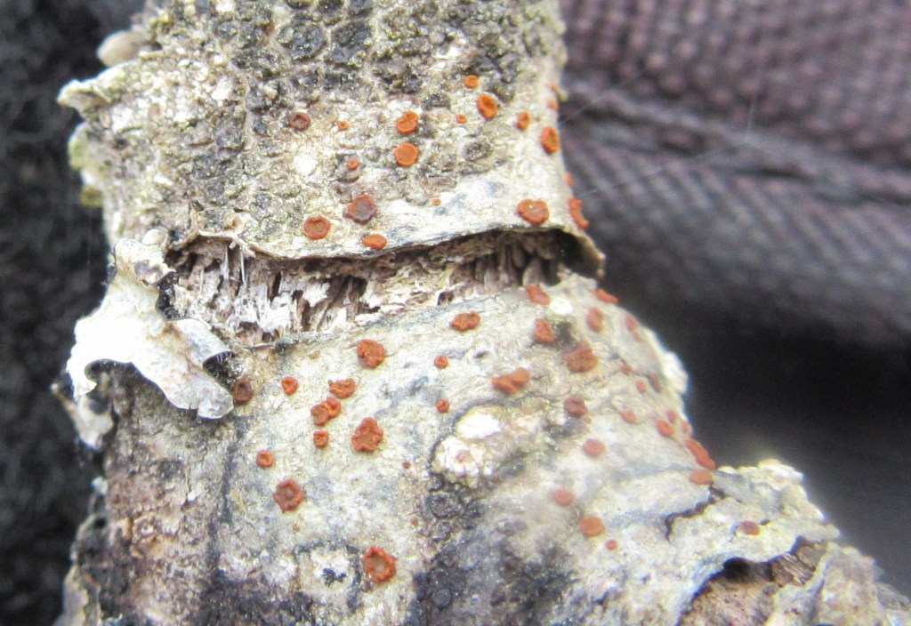 A crustose species with an often white-grey, thin thallus. The orange apothecia often have a distinctively flexuose margin.