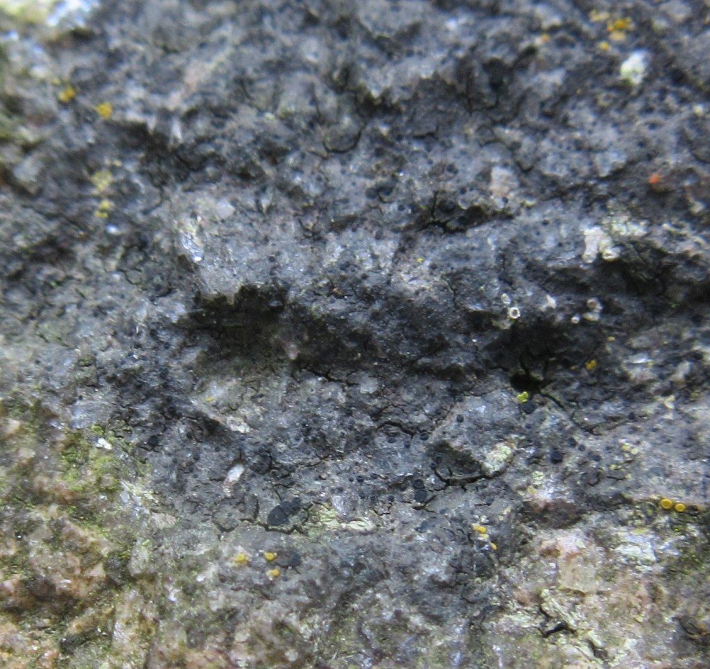 A crustose species with a grey, greenish grey to black thallus that is effuse or sometimes even evanescent. The thallus may be areolate and may have a black prothallus. The small, matt black apothecia are flat or convex and may have a thin margin.