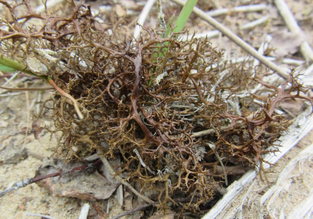 Cetraria aculeata is distinguished from Cetraria islandica by the narrower lobes that look flattened and furrowed from above.