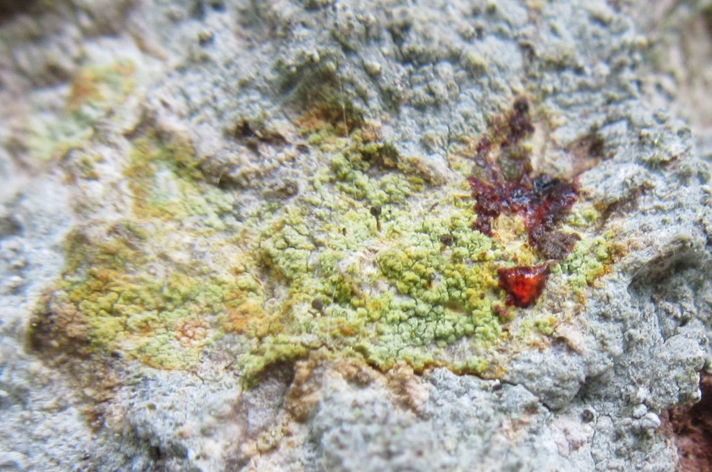 A crustose lichen with an areolate crust that is often blue-grey to orange-grey and that has orange or mustard-yellow patches. If present, the apothecia are stalked.