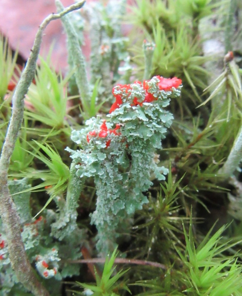 This Cladonia species stands out for its bright red apothecia. The greyish yellow, much incised squamules of the primary thallus usually disappear early. The podetial have numerous peeling squamules and never sorediate. They may or may not have a narrow cup that is plugged by bright red apothecia. Rarely, the cup has secondary fruiting extensions growing from the rim.