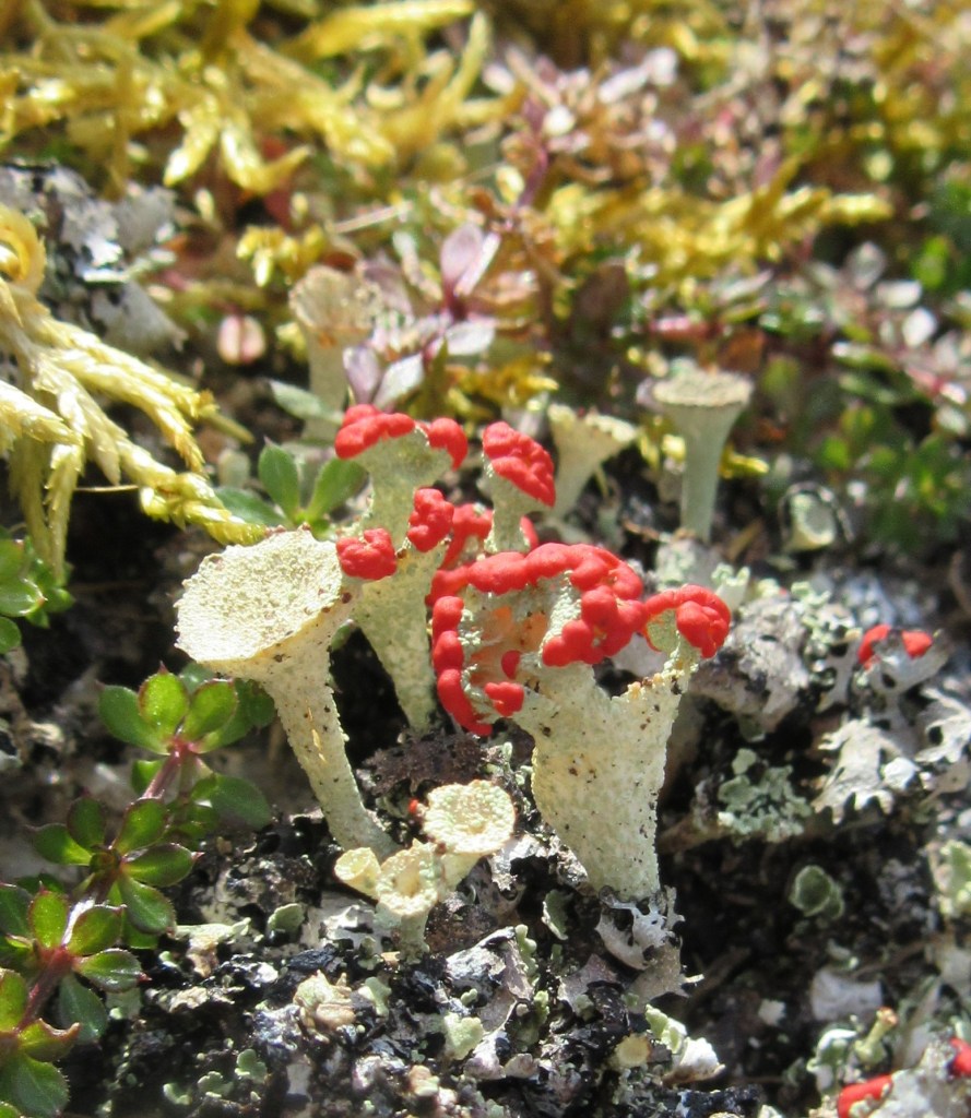 A species with yellow-green, primary squamules that are rounded to incised. The podetia are stout and have wide, yellow-grey or yellow-green cups that are covered in corticate granules and frequently small squamules. The podetia are often deformed. The bright red apothecia and pycnidia around the margin may merge and cover the whole cup.