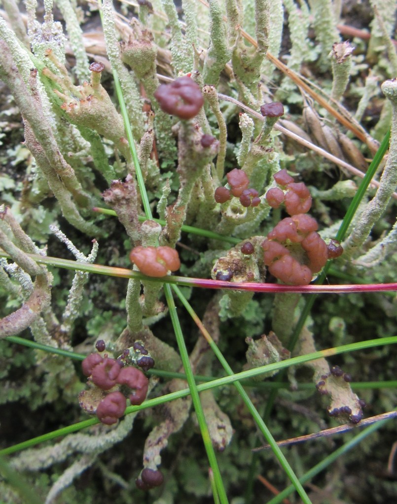 This is a species with small and brittle, basal squamules that may turn back to reveal the white under-surface. Podetia may be branched and may end in a point or narrow cup that carry brown apothecia that turn semi-translucent when wet. The surface of the podetia is covered in coarse squamules which break off easily when dry, leaving large areas decorticate.