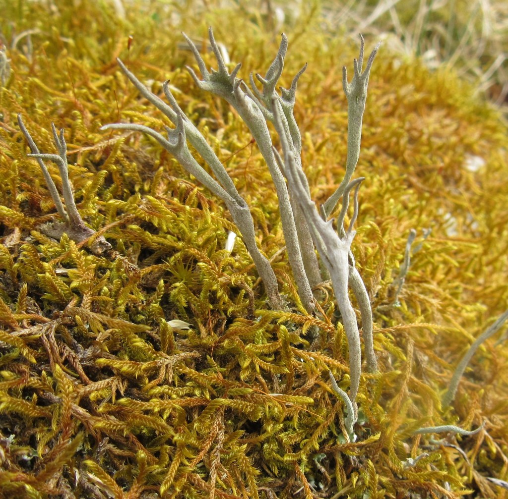 A species with an insignificant primary thallus, but prominent dull to bright grey-green podetia that are tall, irregularly branches and with pointed apices that appear antler-like. The podetium is entirely farinose-sorediate, though the base may be corticate.