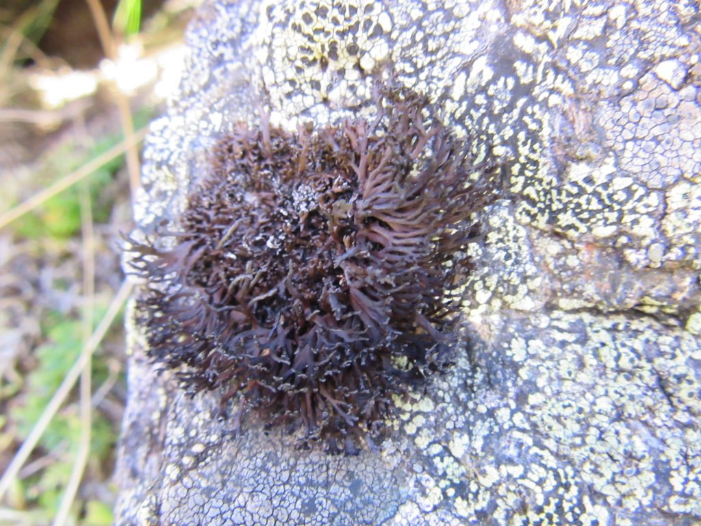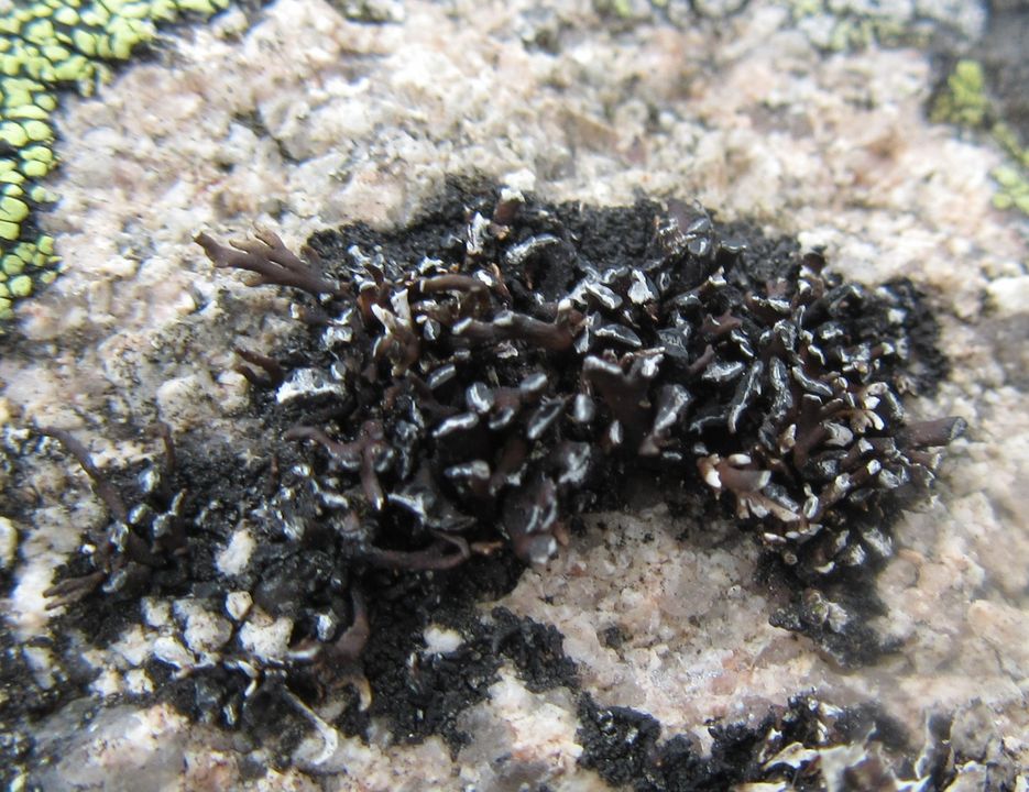 A distinctive, fruticose species with a brown-black thallus that can be up to 2 cm high. The flattened branches may be sparingly branched. When present, the (sub)terminal apothecia have large, shiny black discs.