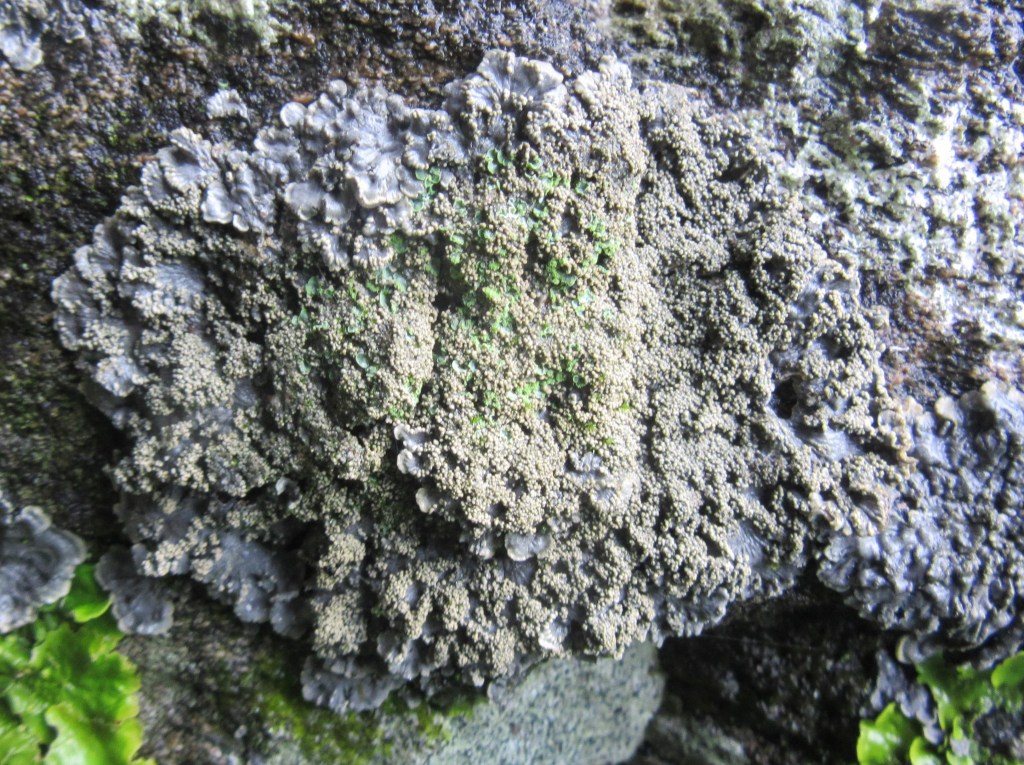 A foliose species with a bluish grey, thick and plate-like thallus. The lobes have fan-shaped ridges and are covered in grey, rather large, knob-like isidia that become confluent and may cover entire surface of the thallus. When present, the orange-brown apothecia darken with age.