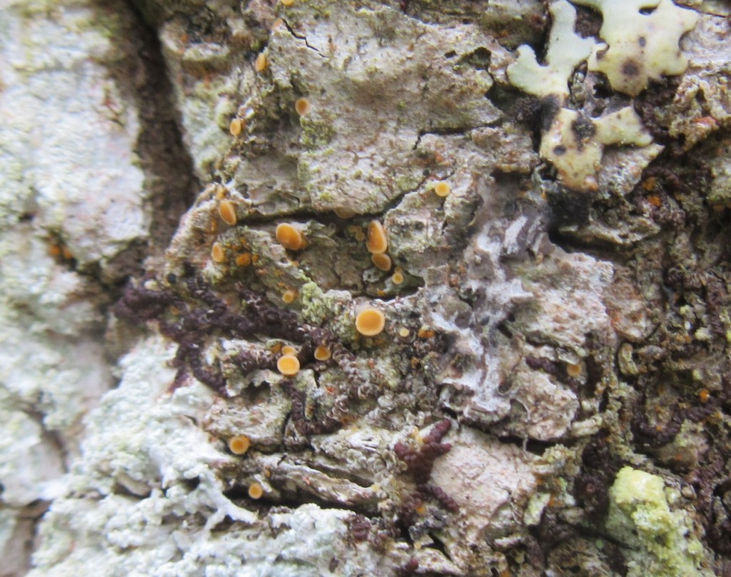 A crustose species with a light to dark greenish grey thallus that is often hardly visible. The bright orange apothecia have paler, translucent margins, and are usually abundant.
