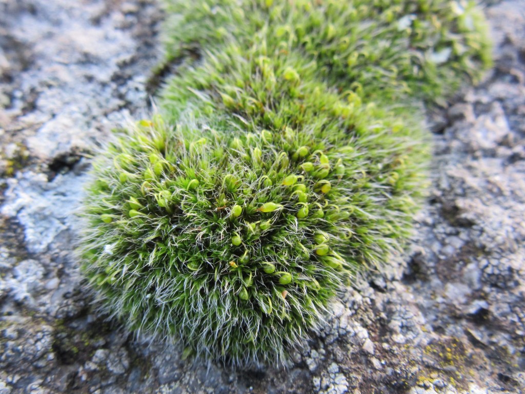 A distinctive acrocarpous moss that forms low, almost furry grey cushions. The dark green leaves are narrow and have recurved margins. The leaf tip is abruptly contracted into a silvery long hair point. This species is instantly recognised by the numerous oval capsules that are held on an arching seta, leaving the capsules burrowed in the cushion.