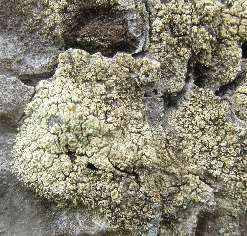 A crustose lichen with a grey-green, thick and coarsely granular thallus that is entirely covered in soredia. The apothecia have greenish buff to flesh-coloured discs and slightly crenulate margins that may be flexuose and become covered in similar granules as the thallus.