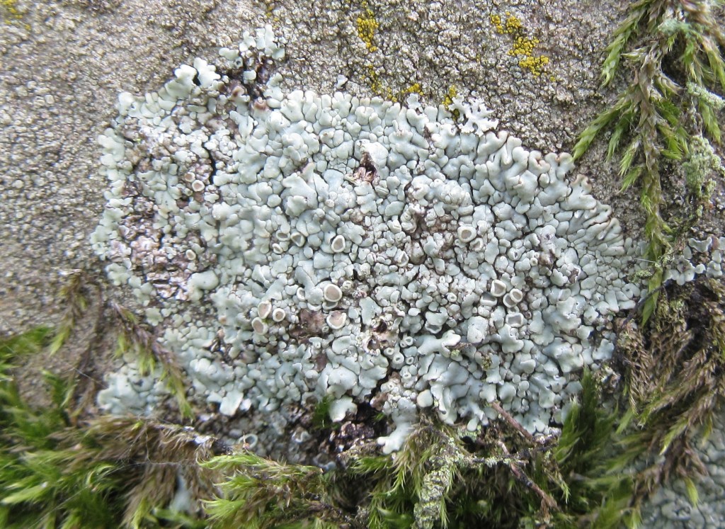 A distinctive species that forms placodioid, circular patches that consist of greenish grey to yellow-grey, adpressed lobes which are often pruinose or pearly coloured around the edges. The apothecia, usually confined to the centre of the thallus, have a creamy brown to brown disc and margins that often become crenulate when mature.