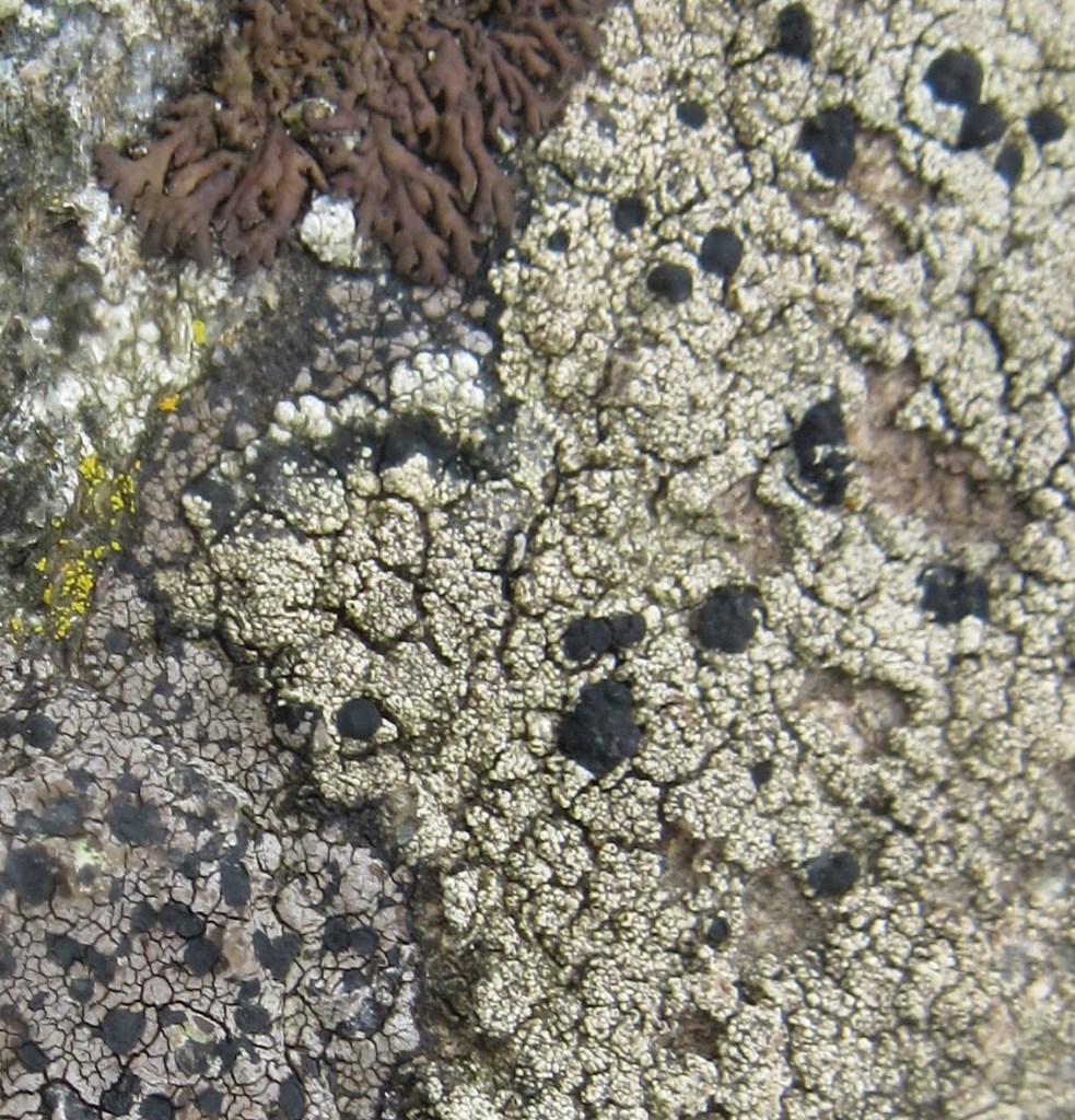 A crustose species that usually forms distinctive thick, and usually granulose, crusts that may be buff to yellow-grey or greenish yellow. Apothecia appear innate at first, but become sessile and convex with excluded margins. The brown to black disc contrasts sharply with the lighter thallus.