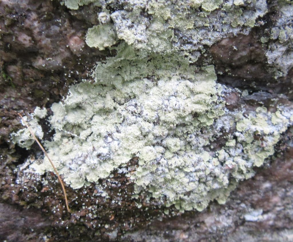 A distinctive, leprose species with a yellow-white, thick, finely granular thallus that forms roughly circular patches. The pale margins are often distinctly lobed and raised.