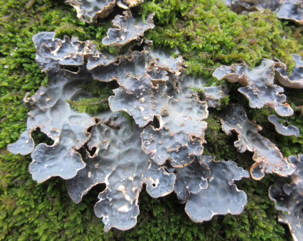 A distinctive foliose species that is yellowish grey when dry and blue-grey to almost black when wet. The large, ridged lobes are only attached to the substratum towards the centre. On lobe margins and ridges there may be coarse, blue-grey soralia and/or dark, almost globose isidia. The species rarely has red-brown apothecia.