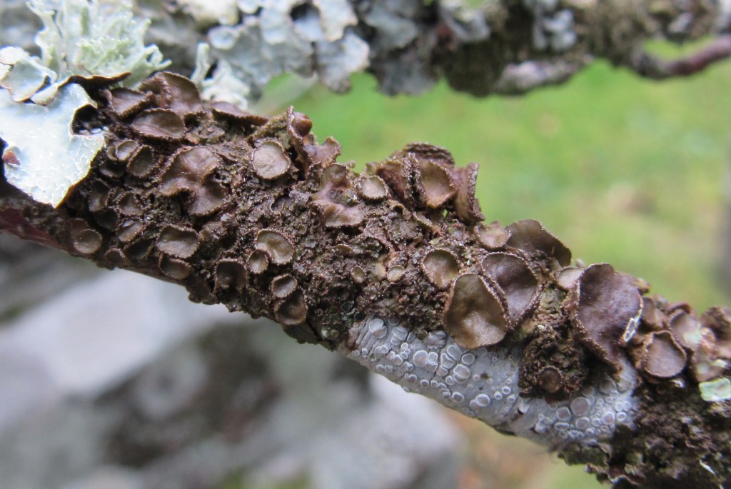 A foliose species with a shiny, brown to olive-brown lobes that are adpressed, short and often widening at the apices which are rounded and only slightly notched. It is usually fertile with large, red-brown discs surrounded by characteristically thick, warted margins.