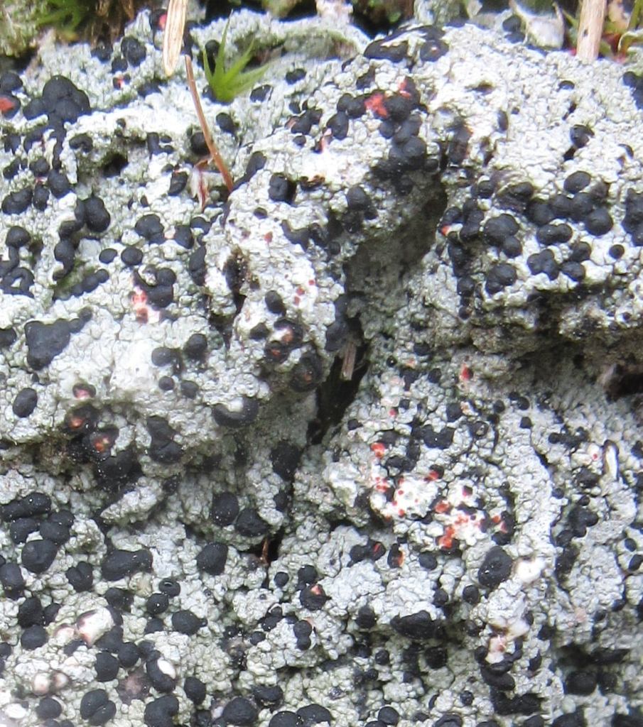 A crustose lichen that forms grey, thick, granular or warted thalli that may be surrounded by a grey prothallus. The apothecia have strongly convex, black discs, that, if scraped, show the red medulla beneath.