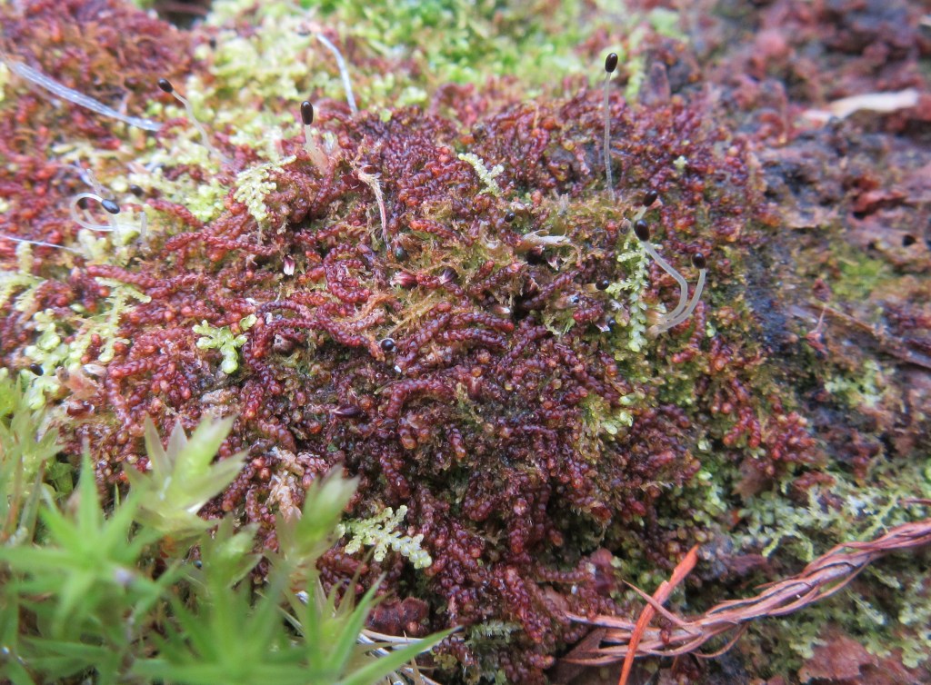 A distinctive leafy liverwort that, from a distance, gives rotting logs a crimson hue. Individual shoots may be dark red or a mix of red and green, but in deep shade shoots may lack red altogether. Each leaf is deeply concave and has two long, curved teeth that come together like pincers.