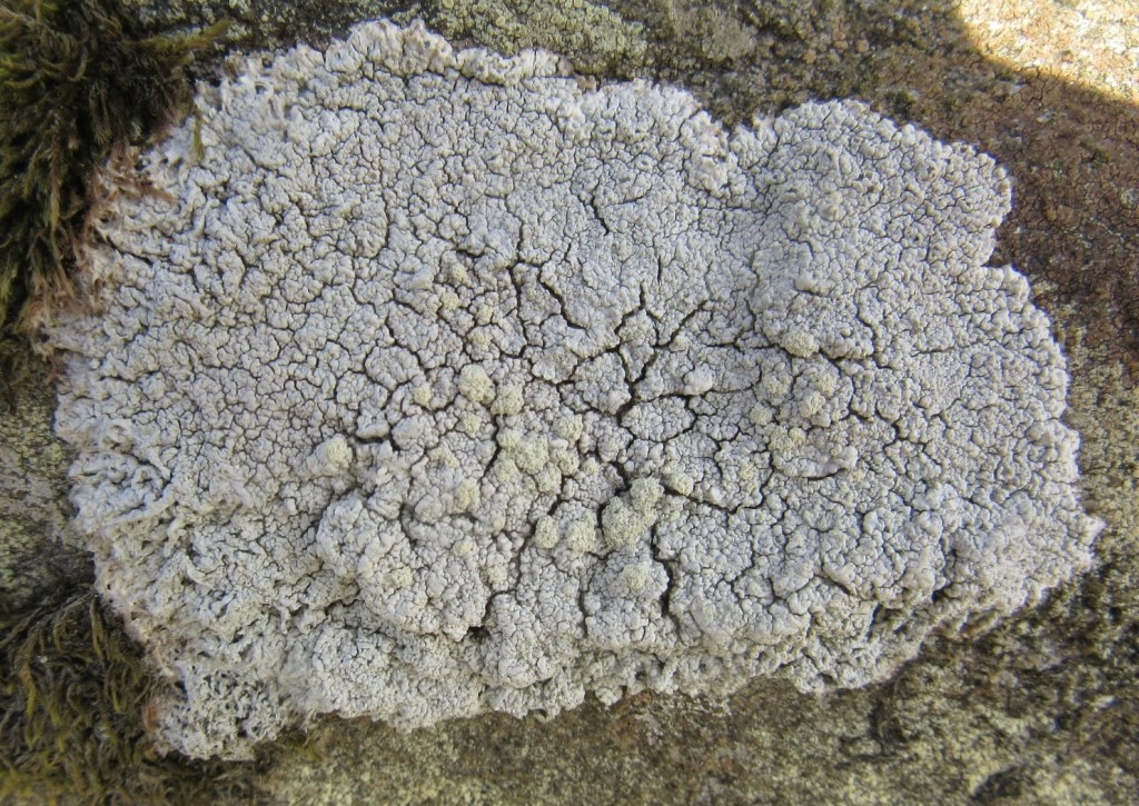 A crustose lichen with a grey to yellowish grey, thick, warted thallus. Yellowish grey to yellow-green soralia are scattered over the surface and sometimes become confluent. When present, apothecia have flat, flesh-coloured to tan discs with a pale, smooth or sorediate, entire margin.
