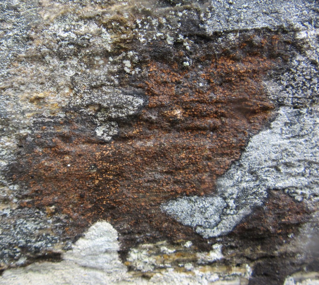 A crustose lichen with a tan to deep red-brown thallus that is fairly thick and may have a leprose or cracked surface and black prothallus. It often forms extensive mosaics. Yellow-buff to light orange soralia are dotted over the surface and may become confluent.