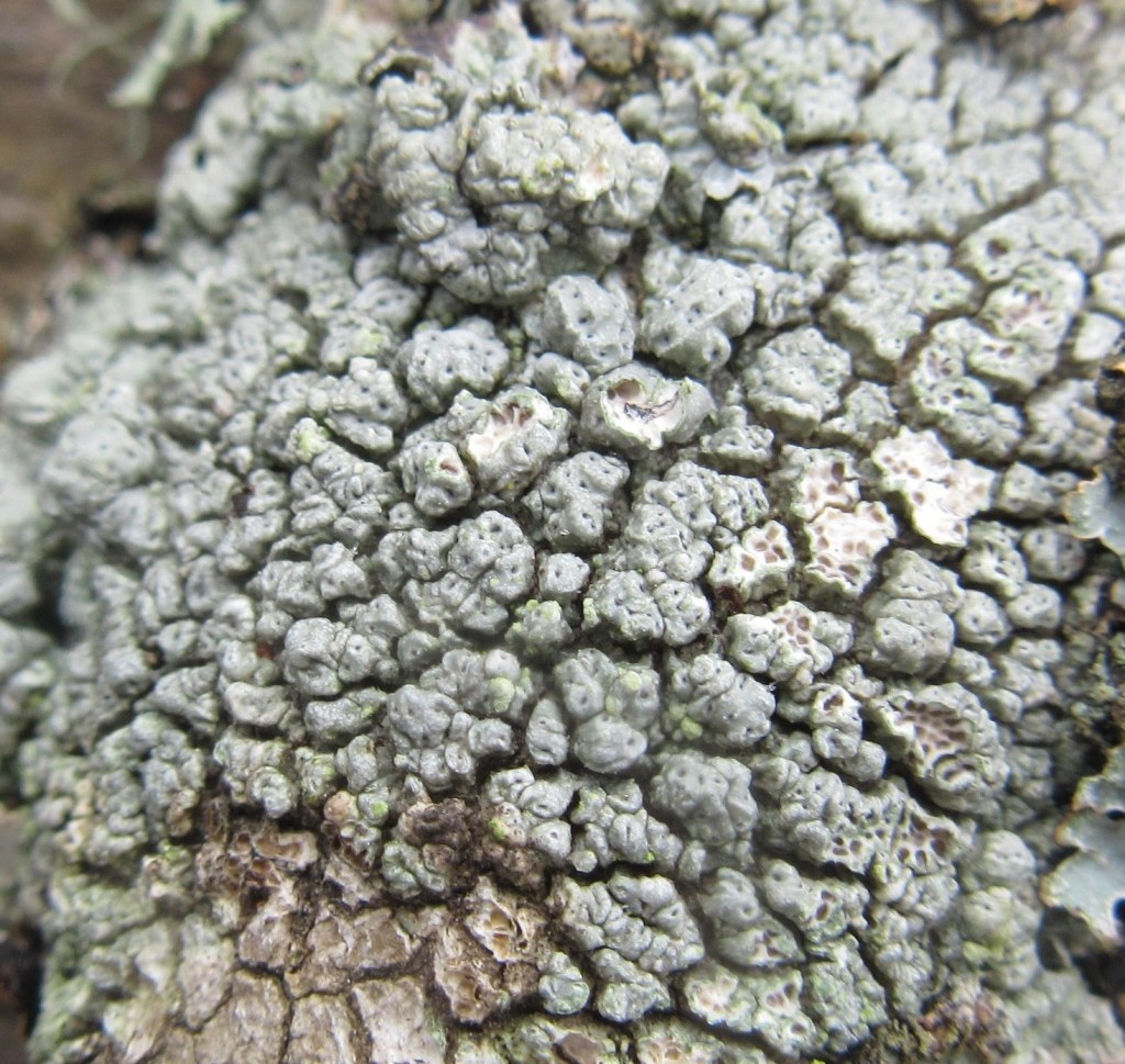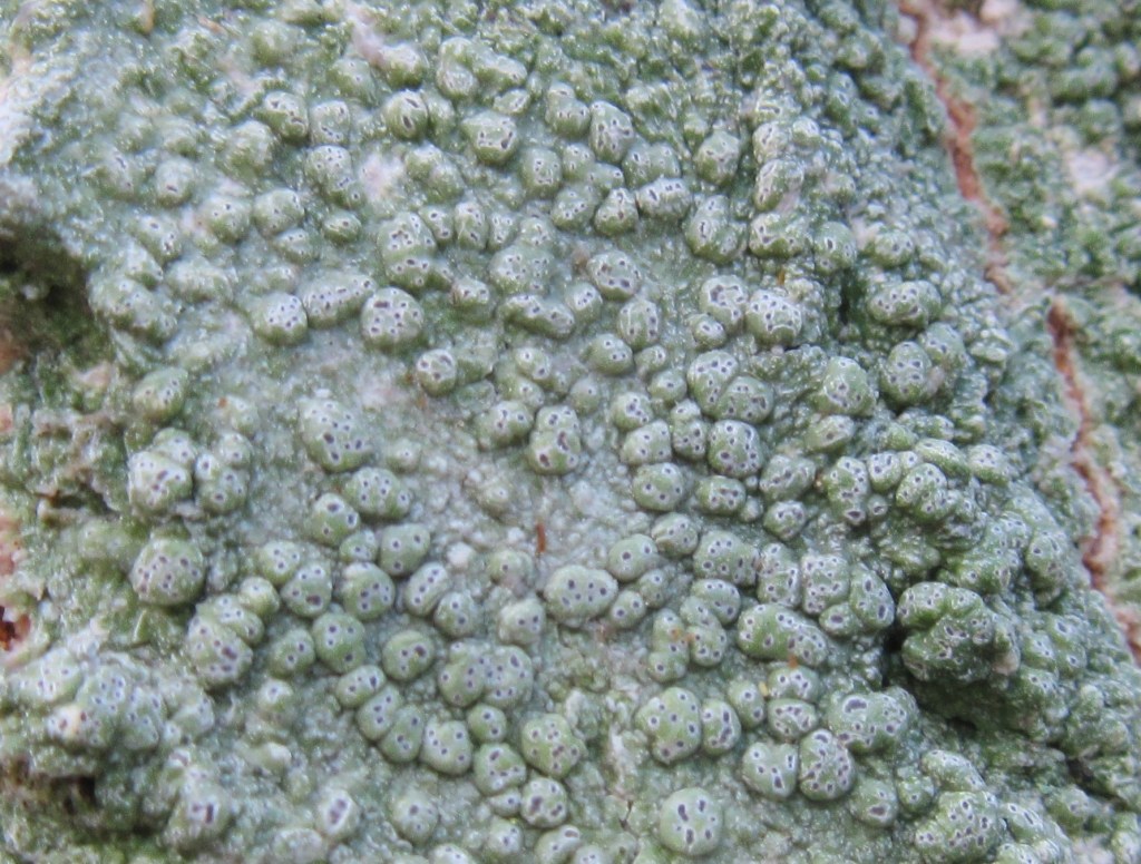 A crustose species with an often greenish grey to grey, thick thallus that forms neat, more or less circular patches. The thallus can be slightly cracked, and is often limited by a concentrically zoned margin and prothallus. The thallus is densely covered in wart-like structures that each reveal two to seven apothecia that look like minute dark pits. Sometimes they are slightly more open and disc-like.