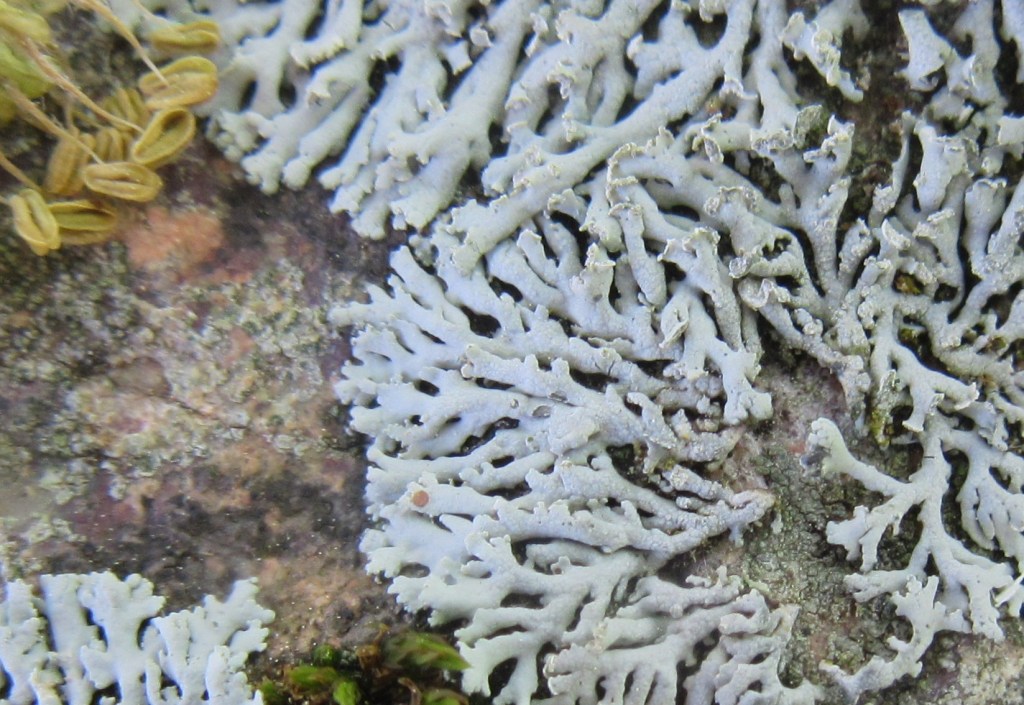 A foliose species with light to dark grey, narrow lobes that are clearly separated from each other and become palmate and ascending at the tips. There are no pseudocyphellae or cilia. Grey lip-shaped soralia are apical but may spread along the lobe margins and become confluent.