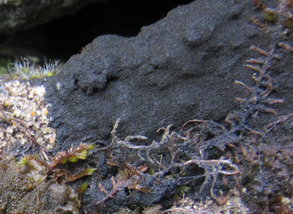 A distinctive crustose species with black thallus that consists of very small, granular-looking squamules that are often gathered in areoles. The thallus is limited by a dark blue, wide, felted prothallus. The thallus maybe be covered by a grey pruina. If present, the black apothecia have a glossy disc.