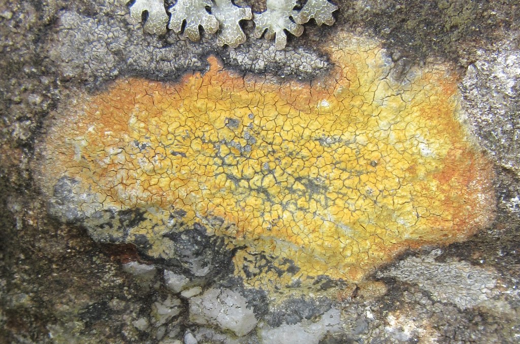 A crustose lichen with a characteristic orange-grey to rust-red, thick, areolate-cracked thallus and a dark prothallus. Pale to dark, blue-grey soralia, often with a white rim, are scattered or grouped across the thallus.