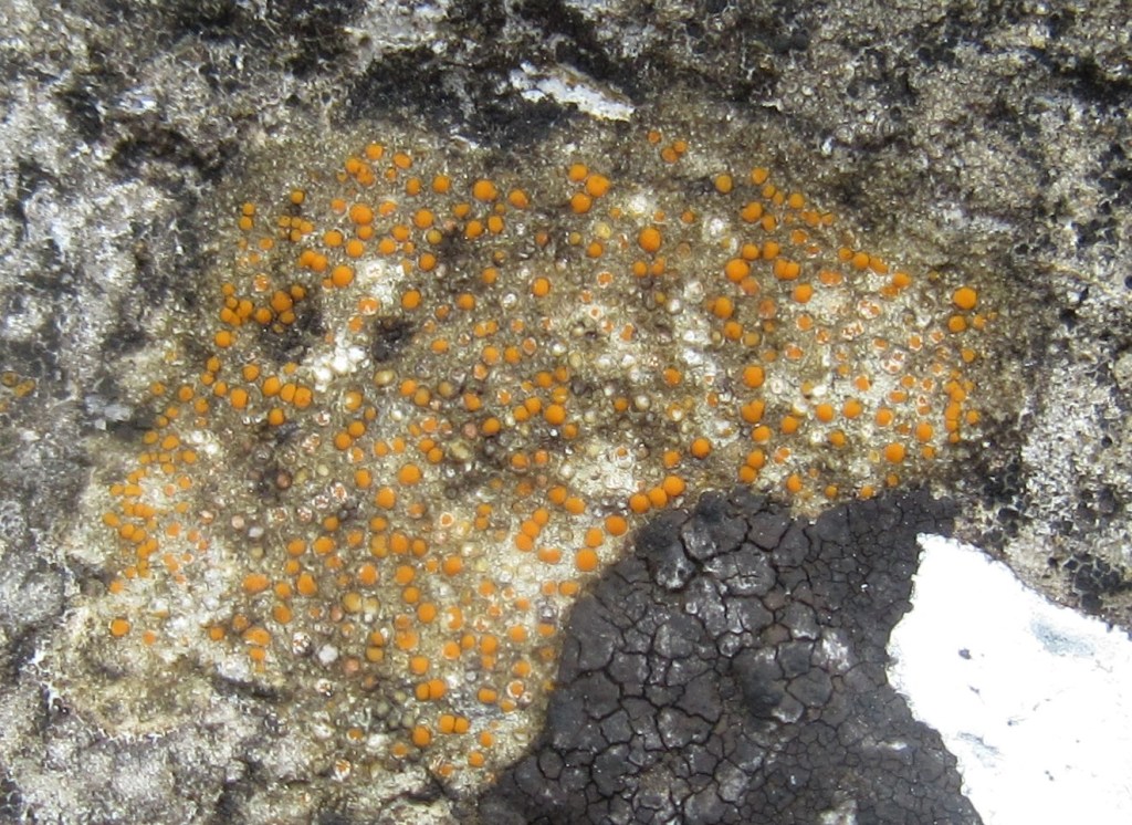 A crustose species with a greenish brown to orange-grey thallus that is cracked. The apothecia are orange, but may acquire a greenish tinge when wet, and become convex and contorted with age.