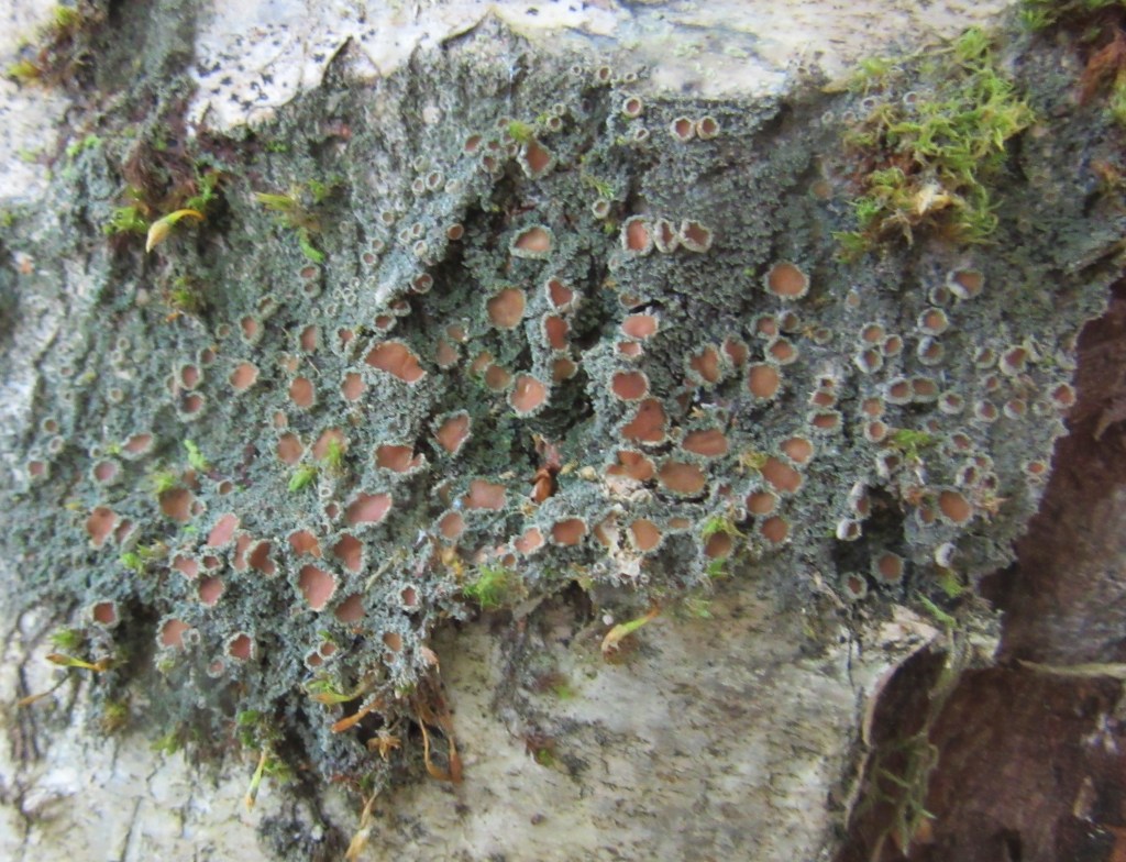 A distinctive, squamulose species with a green to orange-brown thallus that consists of small squamules that are sometimes almost granular, and that look bright green when wet. Scattered over the surface are cephalodia that may be similar in appearance to the thallus or smooth, rounded and brownish in colour. Apothecia are brown to red-brown, with a wide thalline margin that is often knobbly lobate.