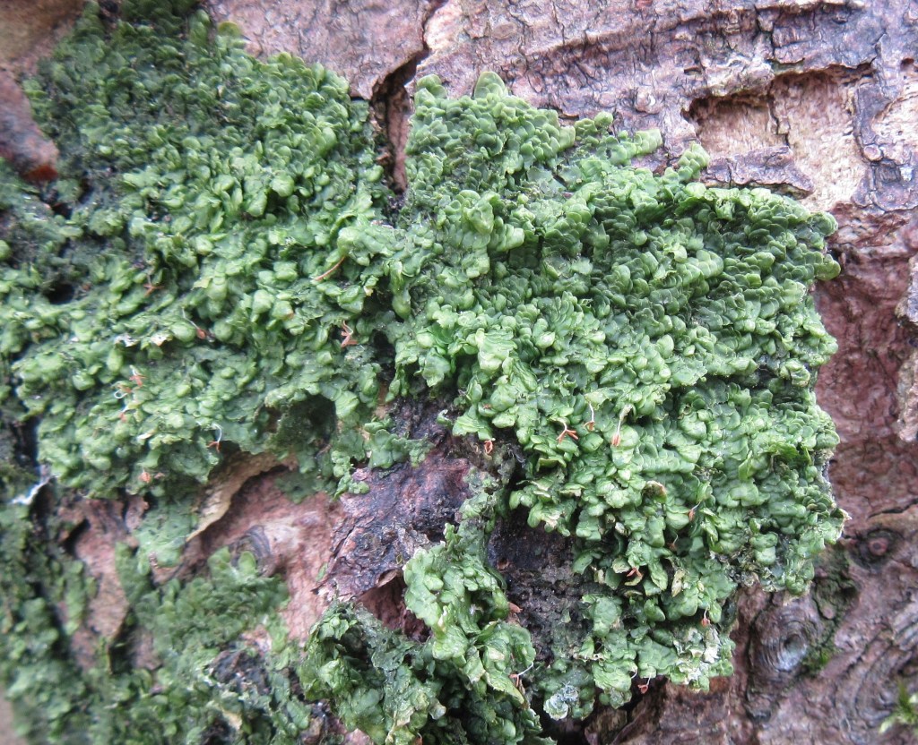 A leafy liverwort with yellowish green, rounded, bilobed leaves that overlap and have a smaller lobule folded underneath. With a hand lens, rounded, sack-like male bracts can be seen on the same shoots as long, flat perianths. The leaf margins may have gemmae.