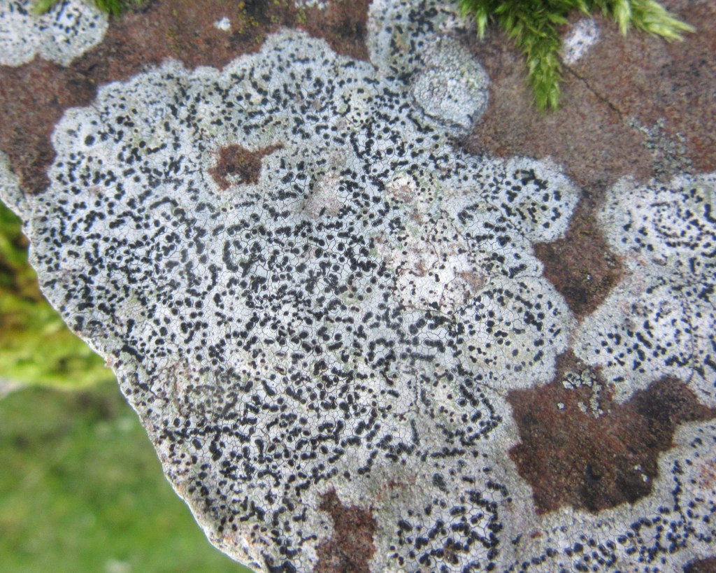 A crustose species with a chalky white to grey thallus that is matt and may be cracked and areolate in the centre. The dark prothallus may be poorly developed. The innate apothecia are often arranged in distinctive concentric rings. The black disc is not pruinose, but may be surrounded by a slightly paler or white-pruinose margin.
