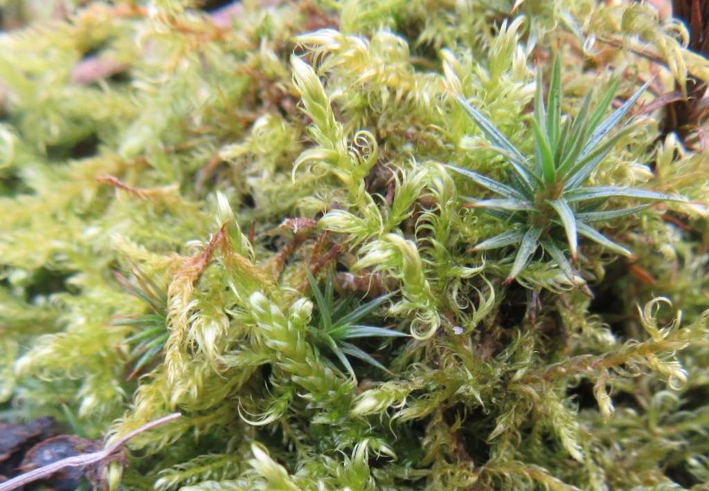 A distinctive pleurocarpous moss with pale green shoots that may grow upright or hang in wefts. Leaves are very narrow, pleated and strongly curved in one direction so as to form complete loops.