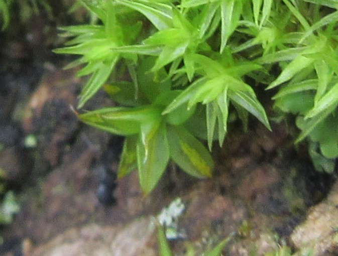 An acrocarpous moss that forms small, dark green patches amongst other mosses. When moist, the broadly oval leaves spread to reveal small, round gemmae. The leaves have an excurrent nerve.