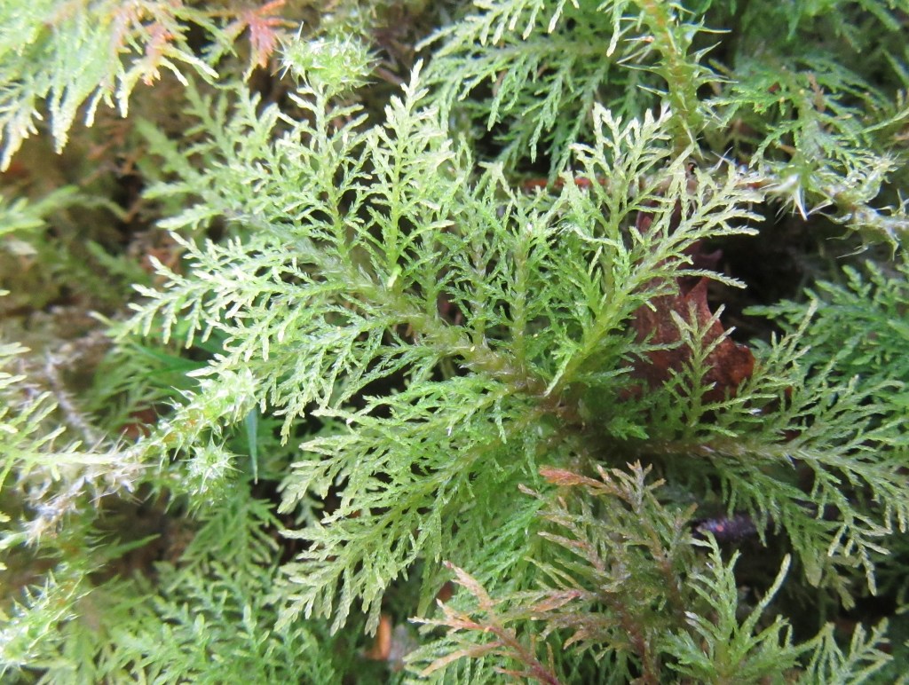 This is a distinctive pleurocarpous moss with bright, yellowish green or dark green shoots that are tri-pinnately branched and form loose mats. The branches are more or less arranged in one plane and tend to be triangular-shaped.
