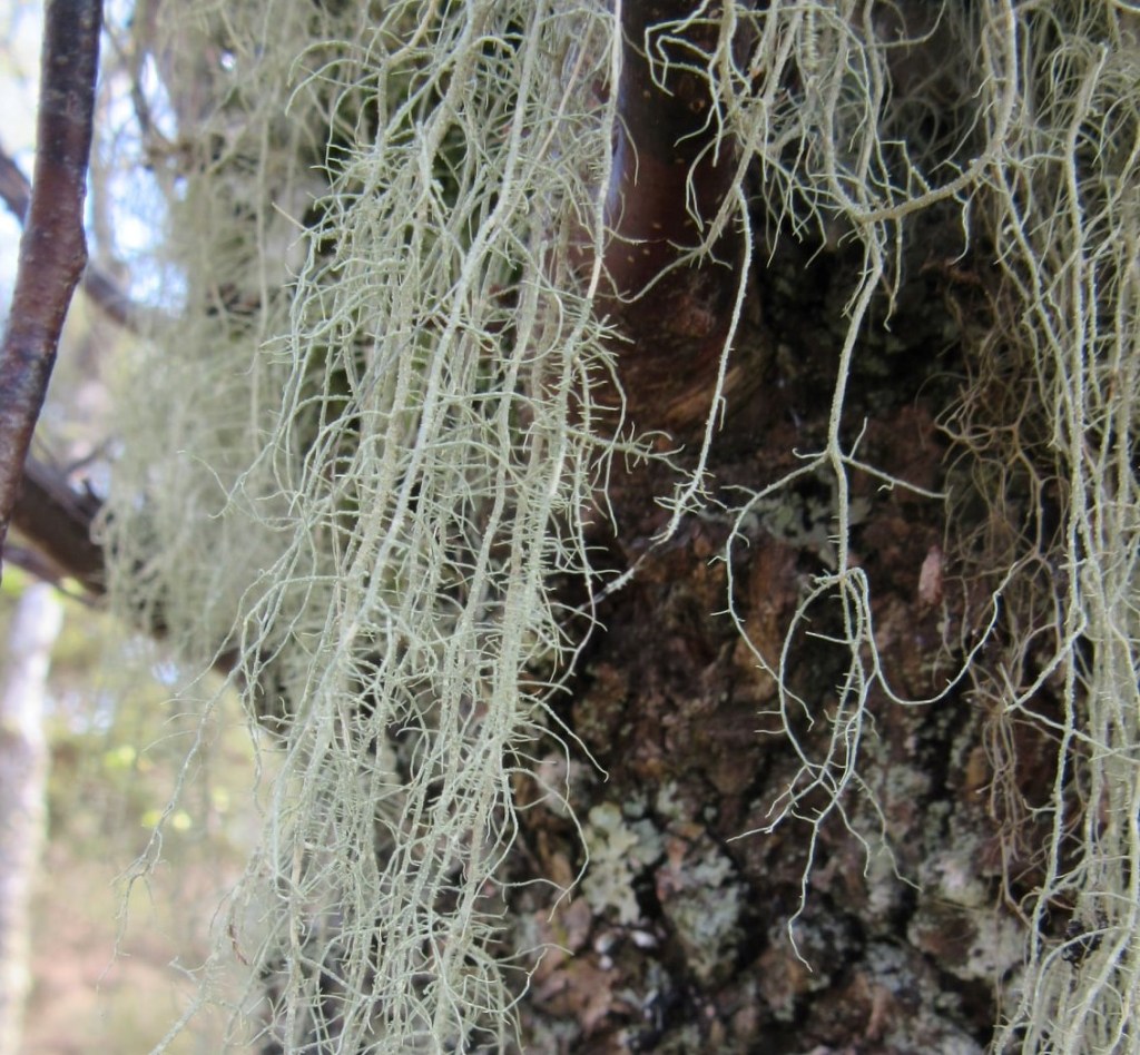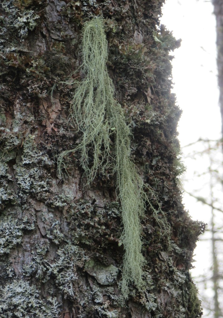 A distinctive, fruticose lichen with a grey-green to pale yellowish green, pendant thallus that consists of a few long, straggling, intertwined main branches and many short side branches that diverge at right angles from the main branches. The overall appearance resembles that of a fishbone. The holdfast is blackened and the main branches have coarse warts from which isidia arise.