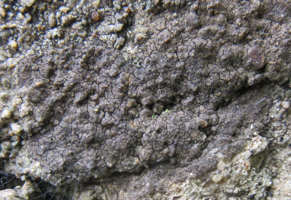 A crustose species with a dark brown thallus that is regularly cracked into smooth areoles. Perithesia cover the thallus.
