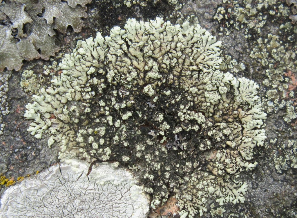 A foliose species that forms small, adpressed rosettes with narrow, radiating lobes that are a characteristic yellow-grey. The centre of the thallus is darker and often almost crustose. Scattered over the surface are distinctive, large, yellowish grey soralia.